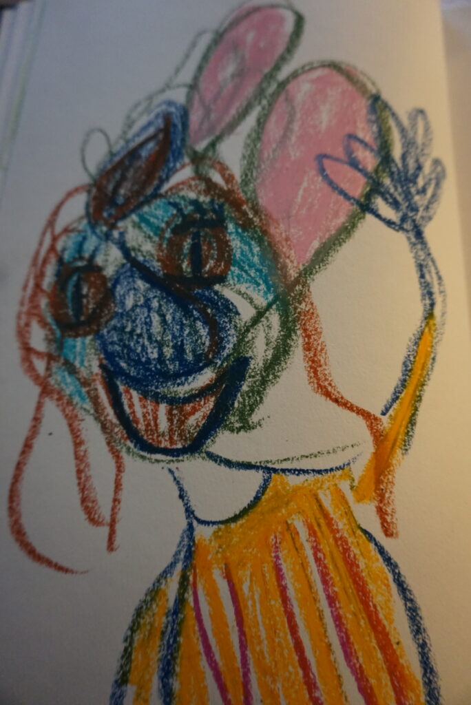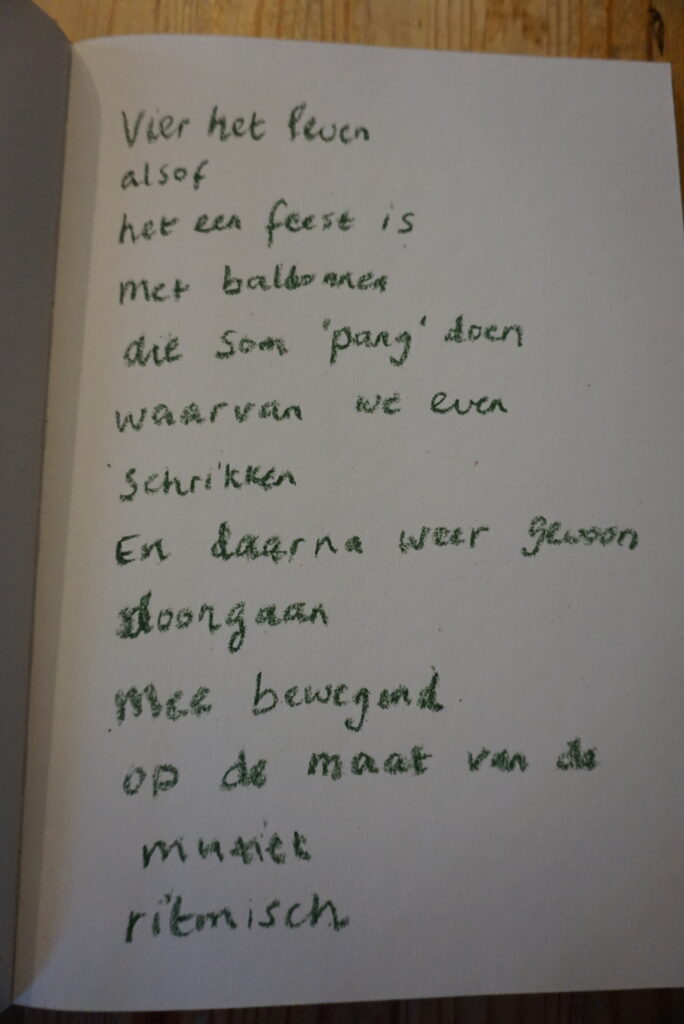 Maar voor mij werkt het dus om ‘snelle’ tekeningen te maken. Van oliepastel, softpastel, waskrijtjes of potlood. En dan er een tekst bij te maken. Zo maakte ik gister een beeld met een tekst over ‘het leven vieren’. En ik dacht aan hoe snel het leven aan mij voorbij gaat. Mijn oudste zit al in groep 7. Ik kon mij nog zó goed herinneren dat hij in mijn armen lag, als baby. Snik, snik. Kinderen worden groot. En ik ook. Tenminste, ouder 😊.